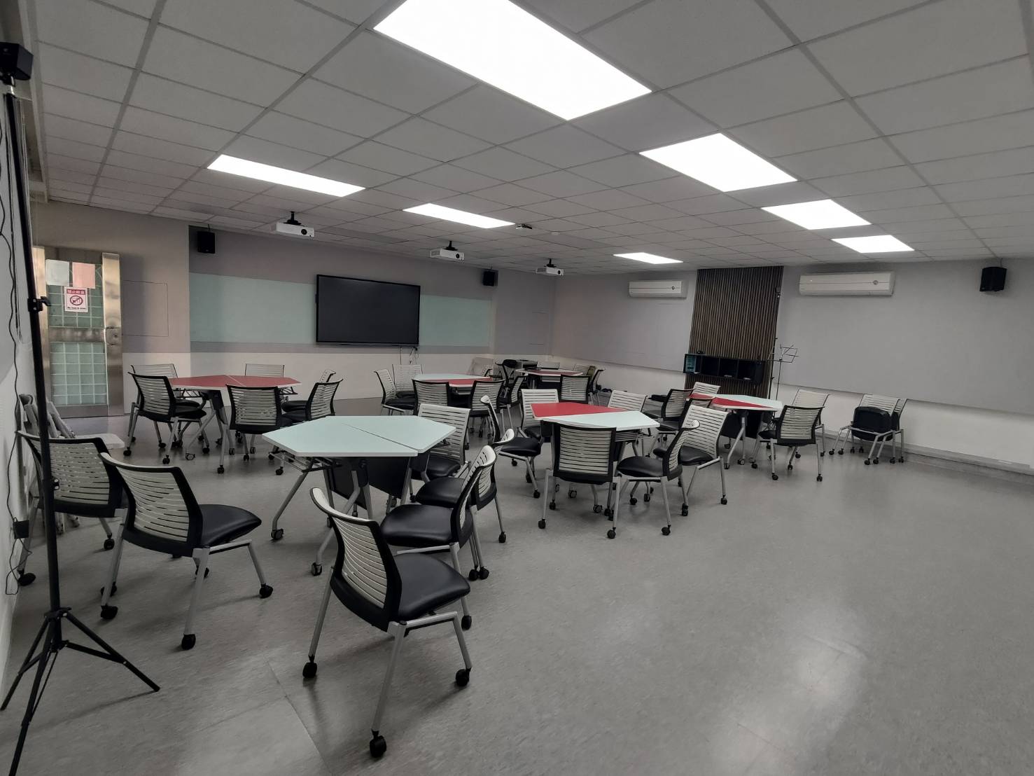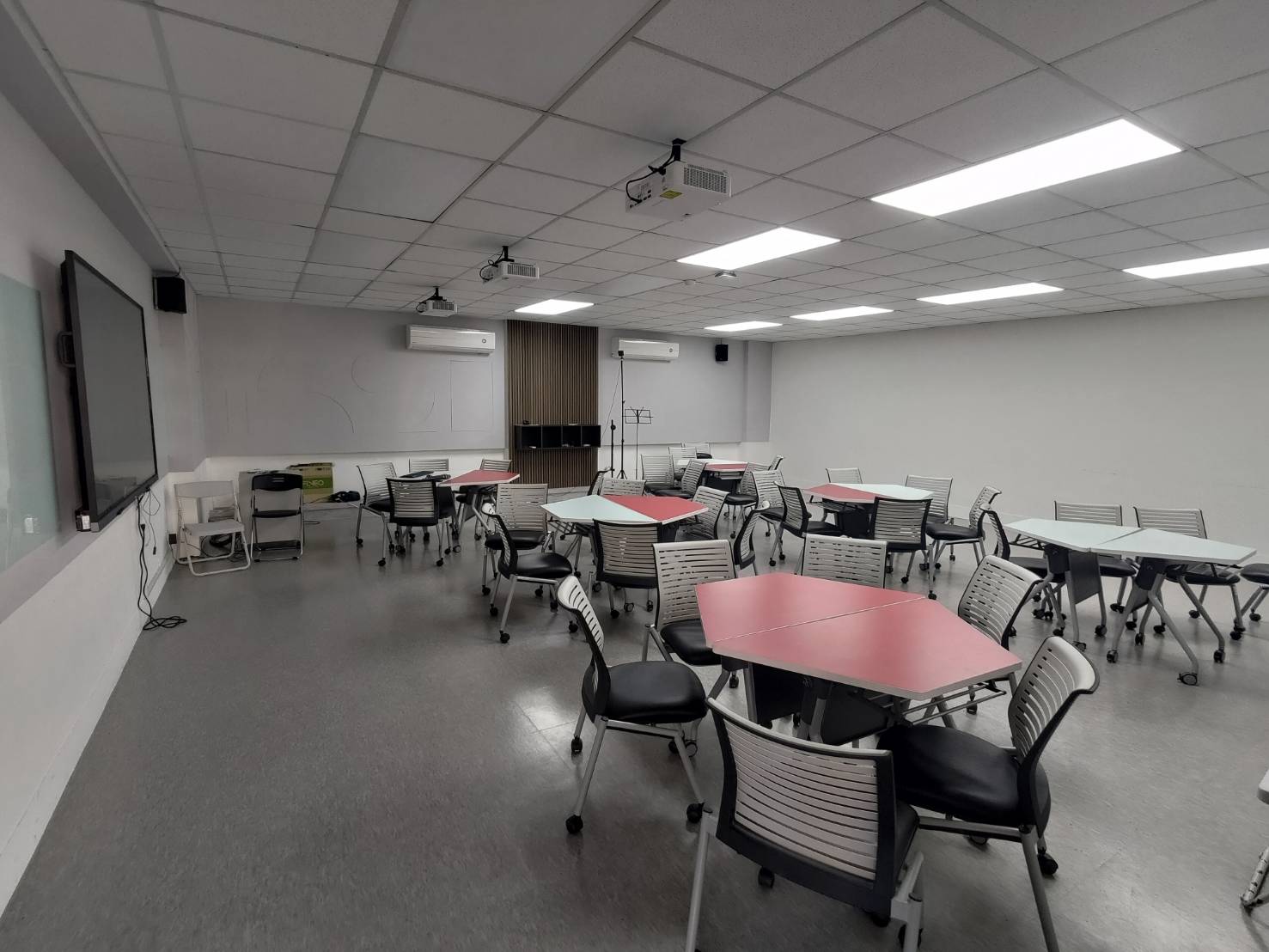 佔地約十二坪,配有吧檯桌、高腳椅,可供師生舉辦外語相關活動或自習之用。