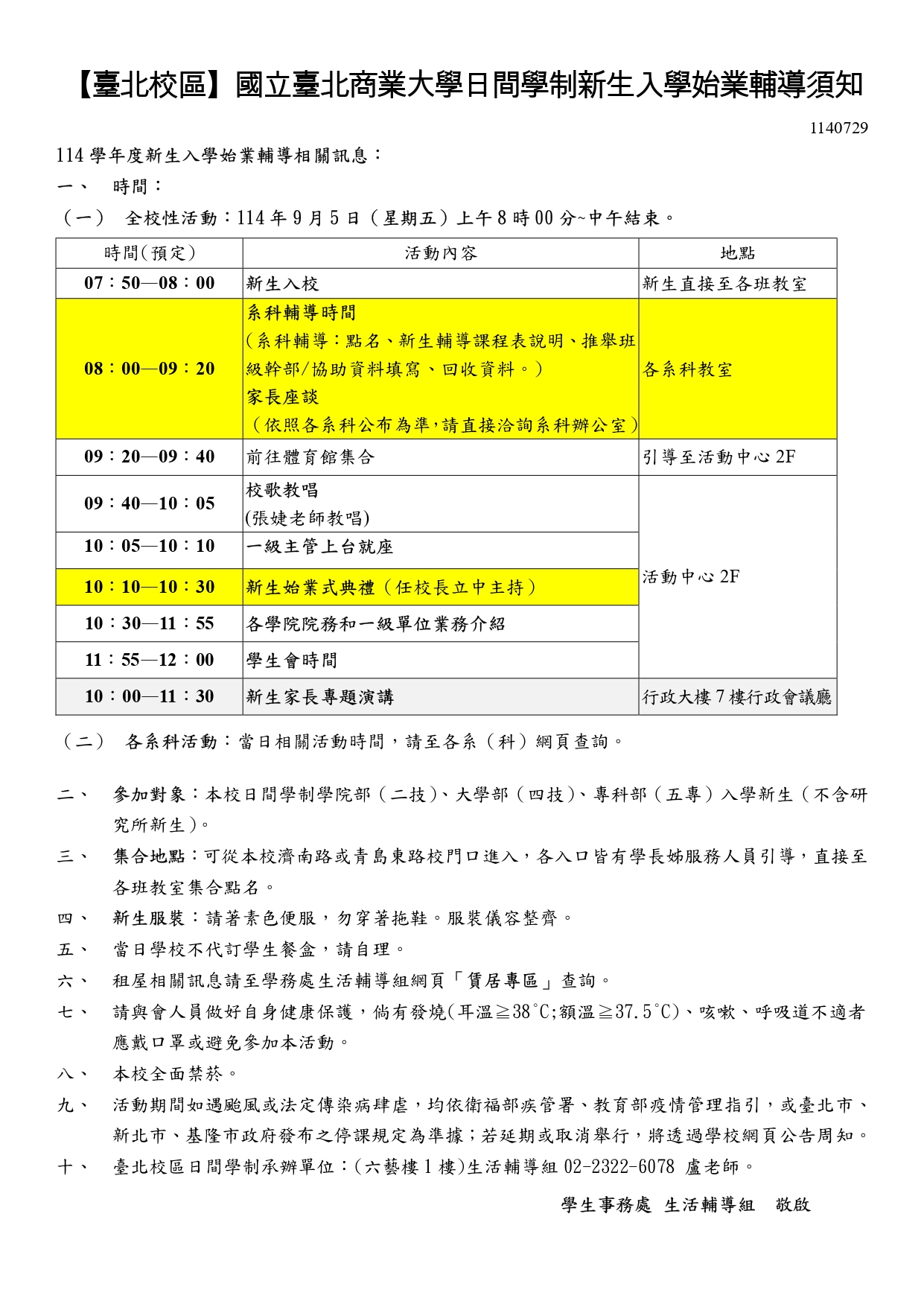 新生入學輔導始業式典禮後,依校務介紹、各部門業務簡要報告。 請報告單位視業務需要,自行準備相關資料。 |